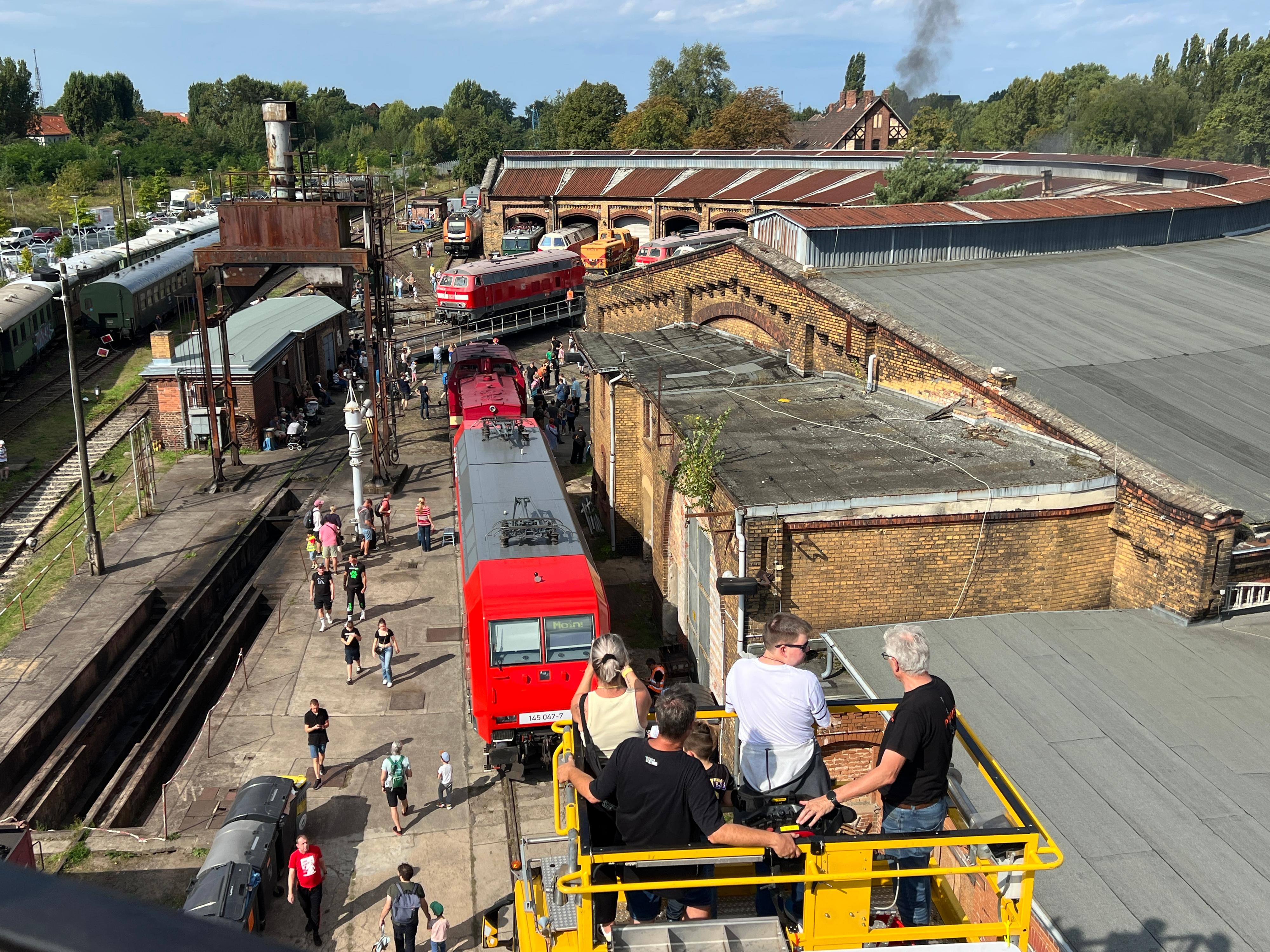 Ein neues Highlight war dieses Jahr für die Besucherinnen und Besucher eine Fahrt im Hublift des Eisenbahnbauunternehmens Furrer+Frey. Im gelben Fahrkorb schwebten sie in knapp 20 Meter Höhe über dem Bahnbetriebswerk Schöneweide und hatten eine umwerfende Aussicht: Auf der Drehscheibe präsentierten sich die verschiedenen Loks und Triebwagen beim „Lokomotivballett“ – und der sanierte Wasserturm aus dem Jahr 1906 erstrahlte in frischem Weiß.