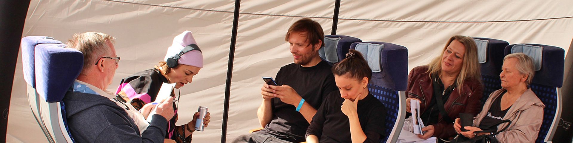 Um die Bahnfahrt eindrücklich zu simulieren, waren am Stand von DB Regio Nordost originale Sitze aus Regionalzügen aufgestellt, auf denen Interessierte Platz nahmen. Dann spielten Johanna, Natascha und Paul vom „Theater (in) Zivil“ typische Situationen des Bahnalltags nach: Rempeleien beim Ein- und Aussteigen, Streit zwischen Fahrgästen und rücksichtsloses Verhalten.